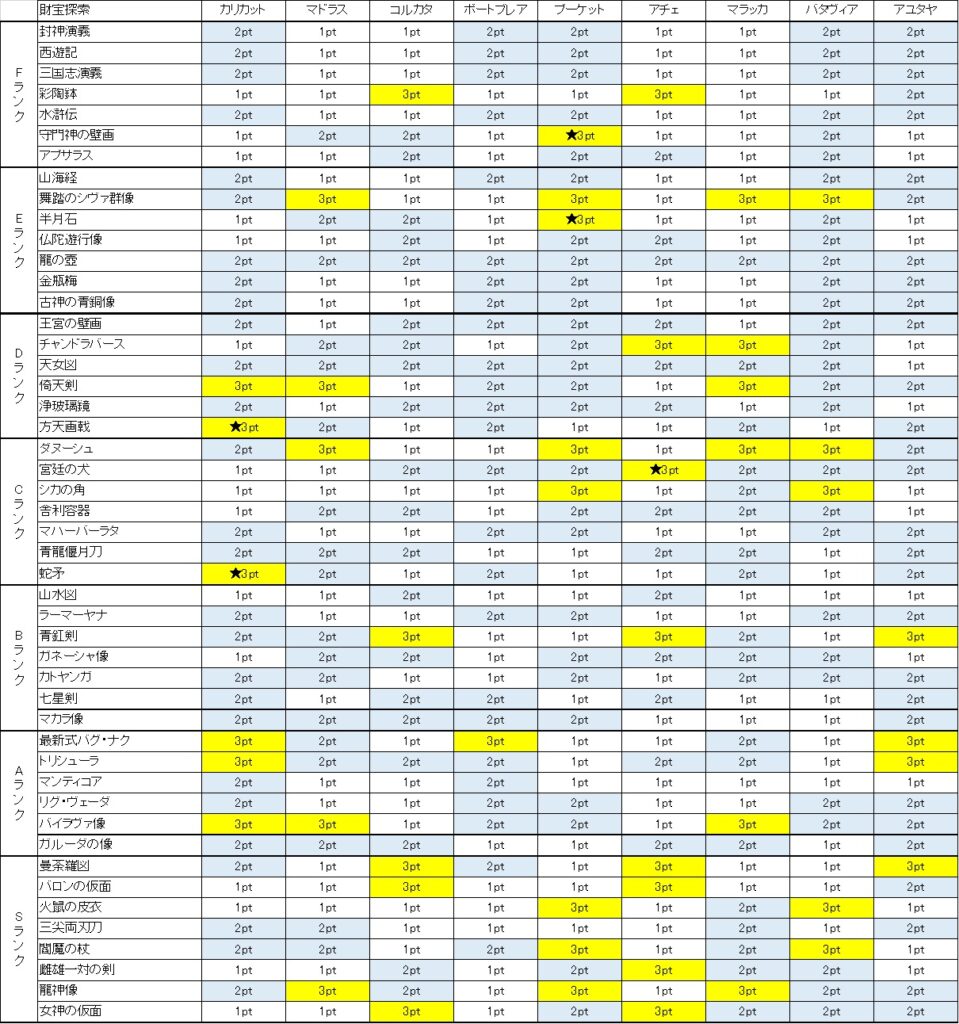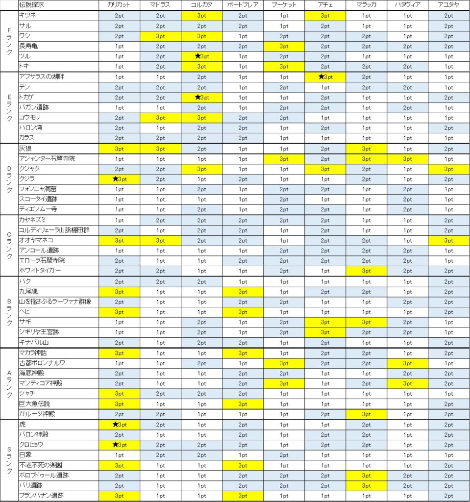 見づらいかもしれませんが、各発見物と総督ごとの枚数ををまとめた画像を下に添付しますので参考にしてみてください。こうやって見るとSランクだからみんなポイント高いってわけでもないんだなと、あと誰からも好かれないやつもちらほら…