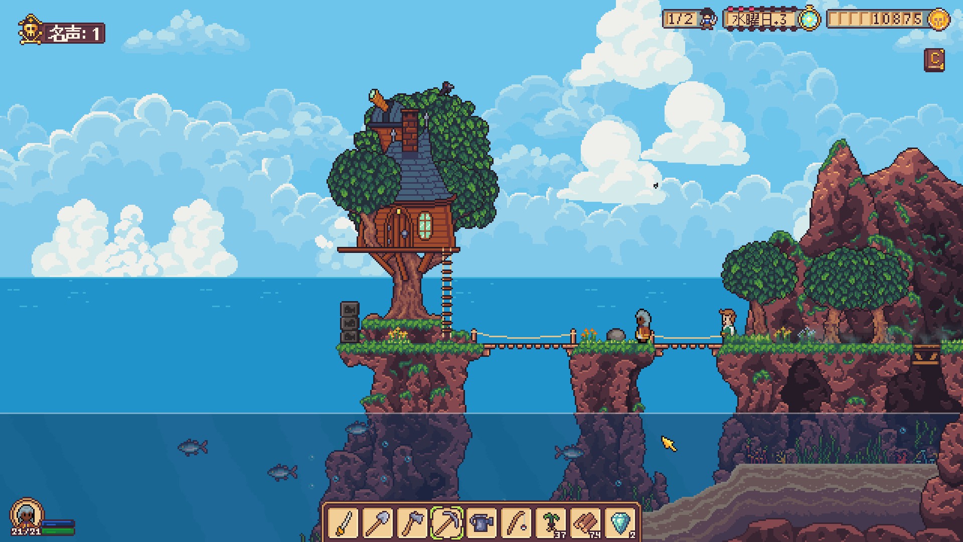 ボトルシップのクエストで行けるようになる、シーブリップ島のマップで、橋と橋の間にある岩をピッケルで壊そうとするとしゃべりだします。